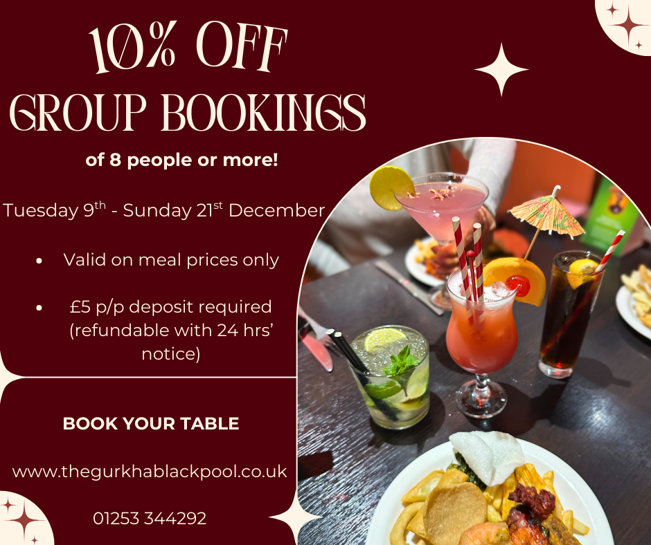 We’re offering 10% OFF group bookings of 8+ people from Tuesday 9th to Sunday 21st December.